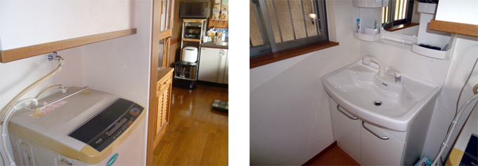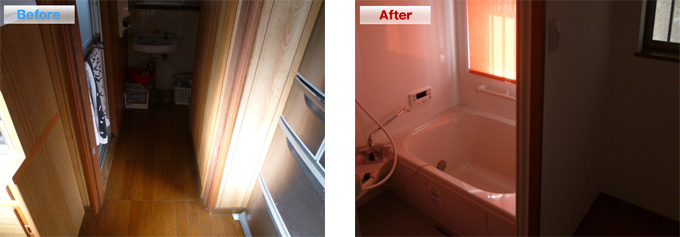 | 工事内容 | 在来浴室からユニットバスにリフォーム、小窓の取付、脱衣所に洗濯機を置くスペース確保のため裏の和室の押入れを下部半分カットし脱衣所側に洗濯機をはめ込みました。 |